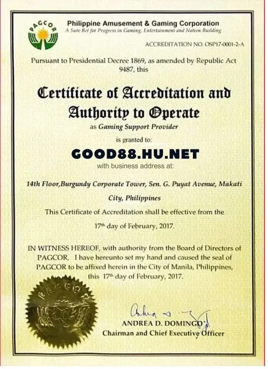 • Giấy phép hoạt động: Xác minh giấy phép hợp pháp với chữ ký và dấu mộc từ PAGCOR.